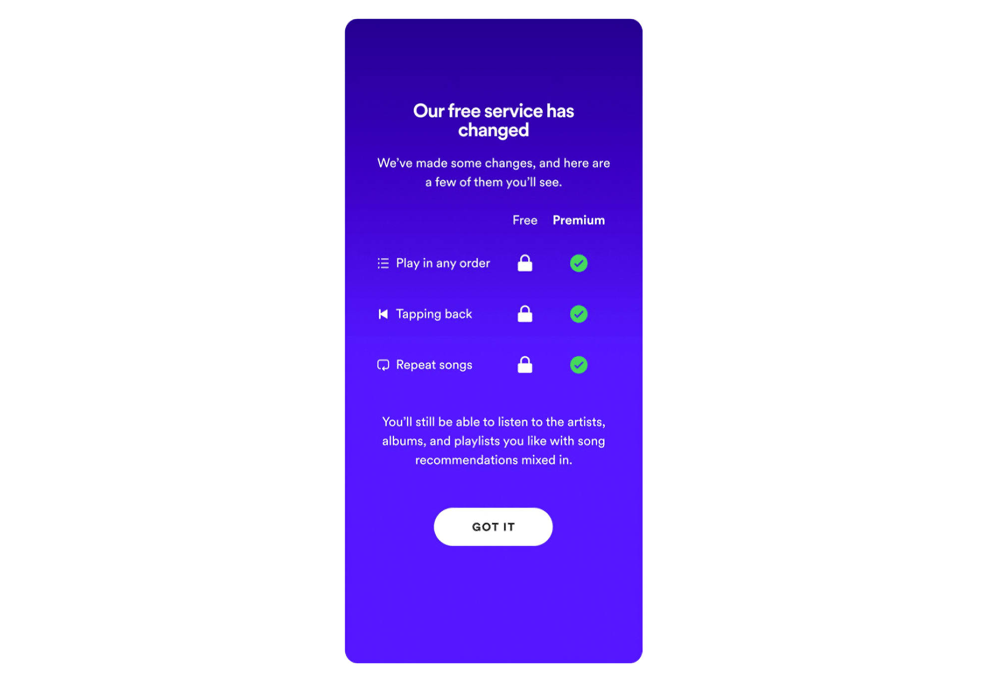 Spotify has always had a simple pricing model, letting you listen to music for free, with ads. It charges a nominal subscription fee of INR 119 or USD 11.99 or AUD 12.99, which is pretty decent. This premium subscription allows you to stream music ad-free, download music, and more. This subscription model has been successful globally. However, with India being a very price-sensitive market, many users opt to use the free plan. As a business, Spotify needs and wants more premium users. In an attempt to improve its revenue, Spotify India rolled out some major changes to the free plan that significantly restrict its features.
