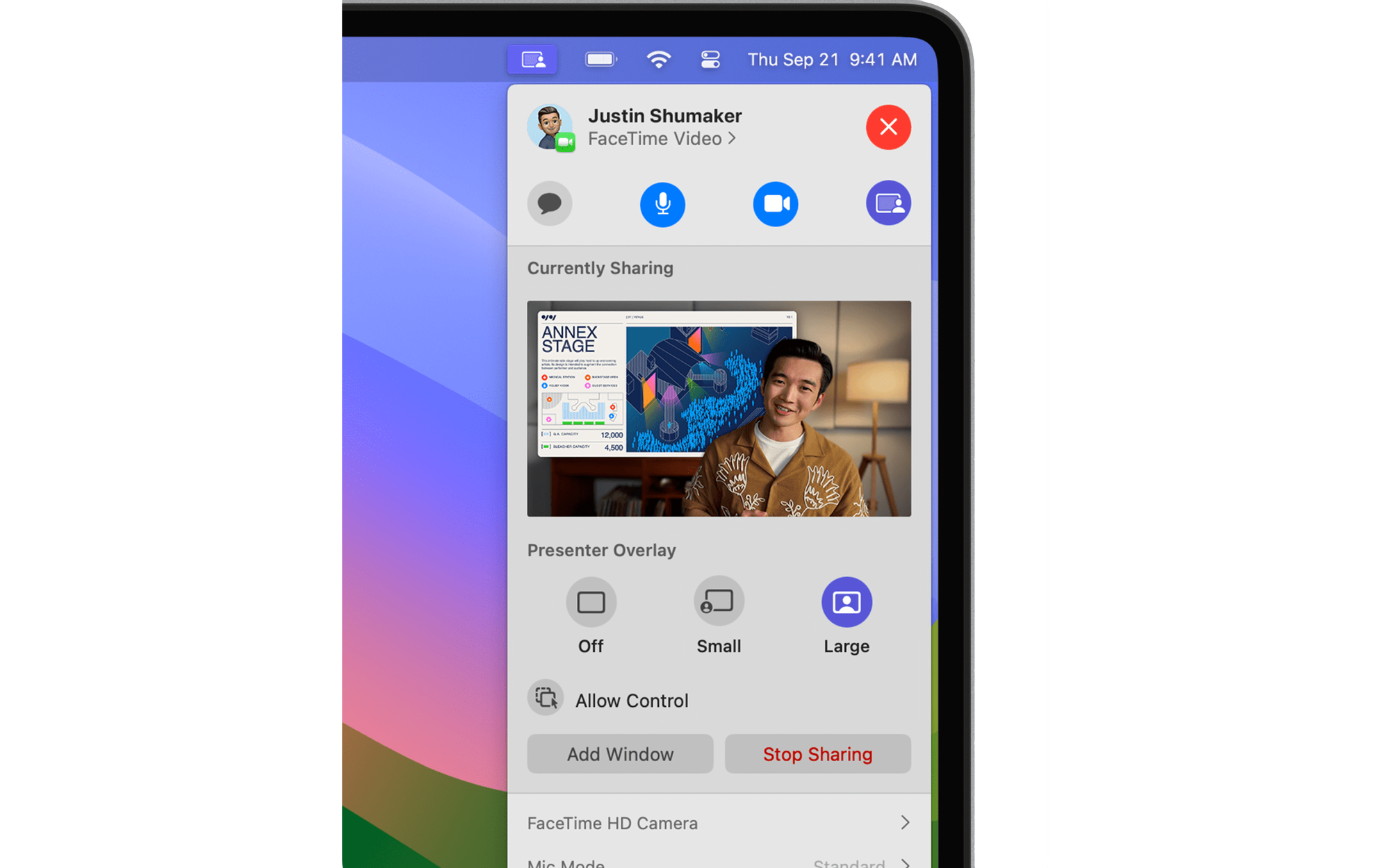 But on a more serious note, macOS Sonoma has some cool video enhancing features like portrait and study light adjustments. Plus, you can also float your video over the screen you are sharing. This stuff is difficult to explain over text so here is a photo of the way you can mock up your camera on video calls.